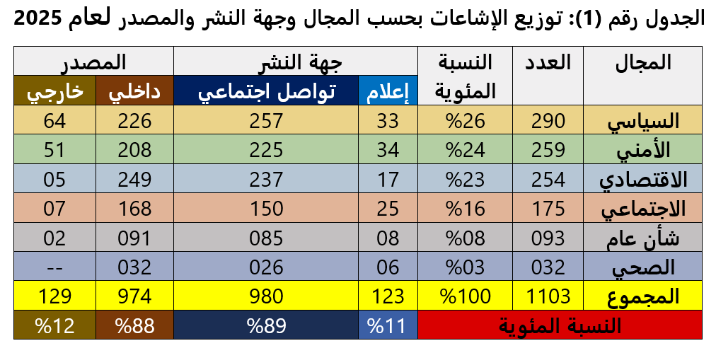 قفزت إشاعات العام المنصرم 2025 إلى 1103 إشاعات، بمعدّل 92 إشاعة شهريًّا، مسجّلة زيادة بمقدار 212 إشاعة، مقارنة بإشاعات 2024، والتي بلغت 891 إشاعة، بمعدّل 74 إشاعة شهريًّا.