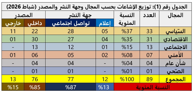 وفي تفاصيل رصد (أكيد) لحجم الإشاعات ومجالاتها خلال شهر شباط، نجد أنها تتوزع على النحو التالي: