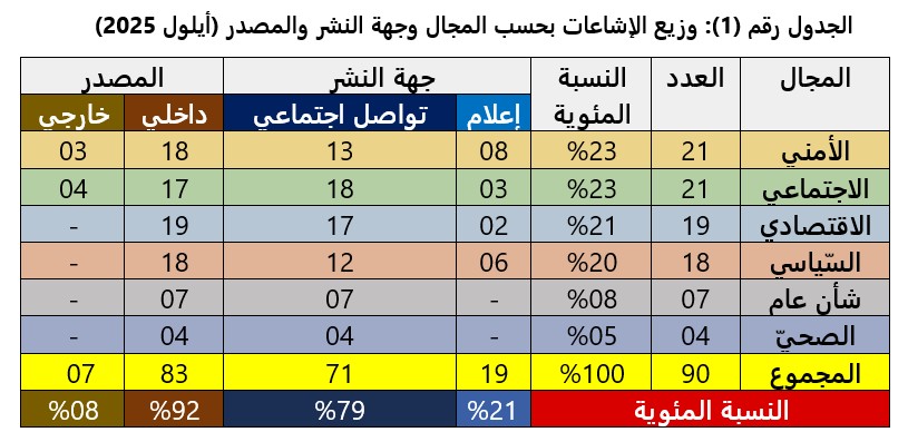 تشاركت الإشاعات الأمنية والاجتماعية المرتبة الأولى في شهر أيلول، حيث سجّل كل منهما 21 إشاعة بنسبة بلغت 23 بالمئة.