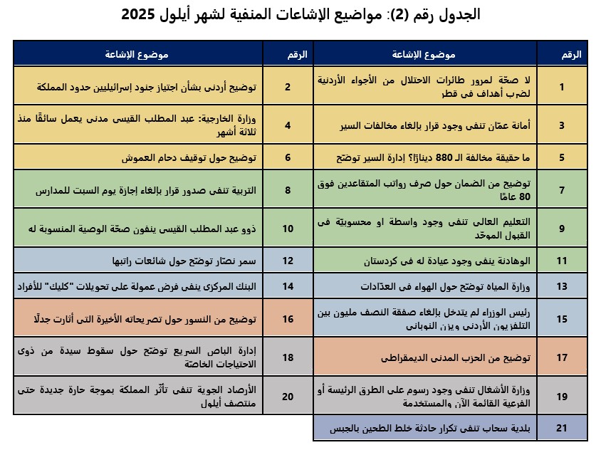 الجدول رقم (2): مواضيع الإشاعات المنفيّة لشهر أيلول 2025