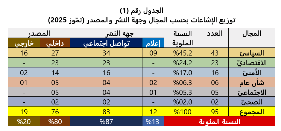 وحول تصنيف الإشاعات، فإنها توزّعت في شهر تمّوز على النحو التالي: