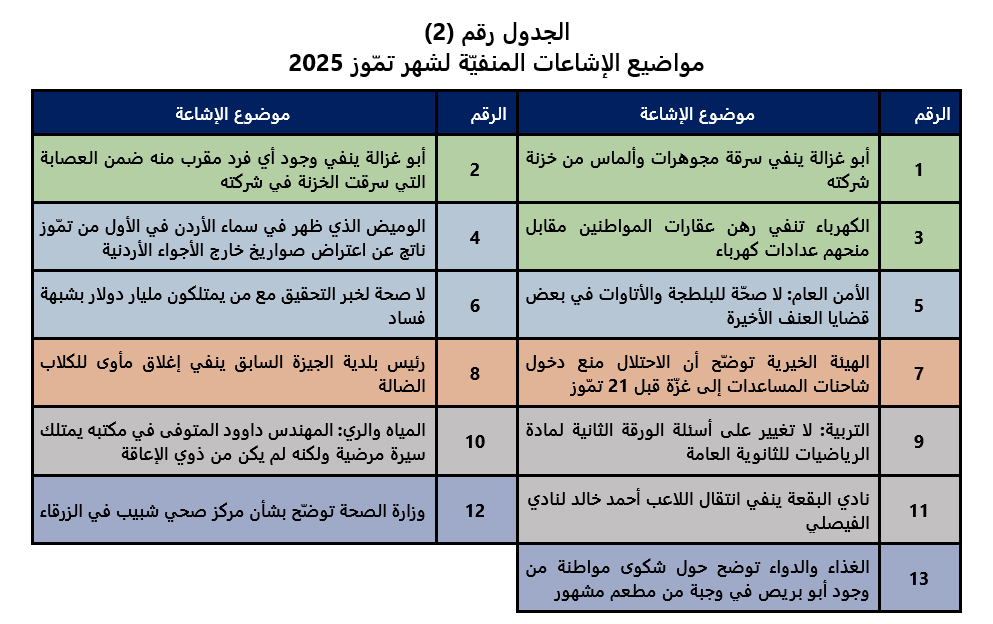 يوفر الجدول رقم (2) حصرًا لمواضيع الإشاعات التي تم نفيها من قبل جهات معنيّة بها خلال شهر تمّوز، ويمكن لمن يرغب في معرفة مزيد من التفاصيل عن هذه الإشاعات استخدام خاصيّة "الهايبر لينك" لهذا الغرض.