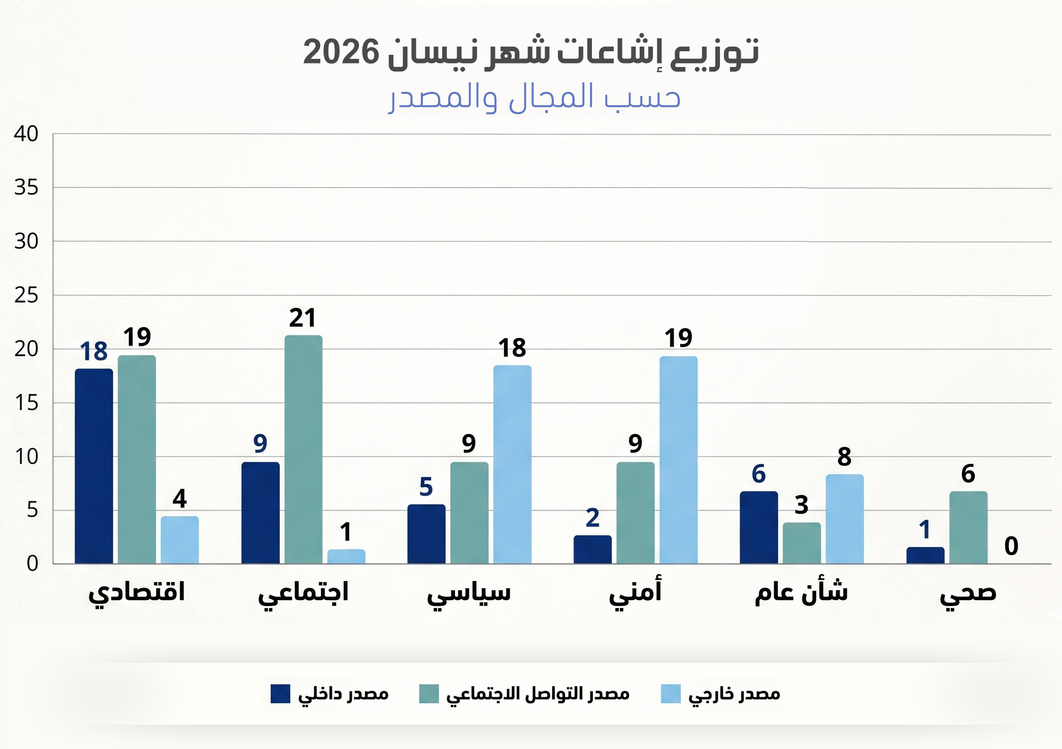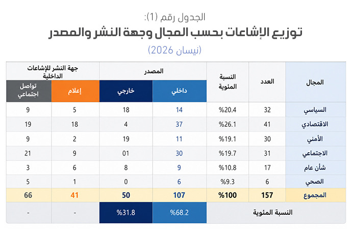 وفي الثلث الثاني من شهر نيسان برزت موجة لافتة من الإشاعات الخارجية مركزة بشكل خاص على قضايا الأمن الوطني، والعلاقات الإقليمية والسيادية، إضافة إلى التحركات العسكرية، وهو ما يشير إلى محاولات توجيه للرأي العام وإثارة القلق من خلال بث مضامين ذات تأثير مباشر على حياة المواطنين.