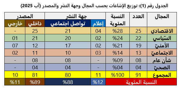 بتصنيف الإشاعات بحسب المجال، نجد أنَّ الإشاعات الاقتصادية تبوّأت المرتبة الأولى في شهر آب، كما هو مبين في الجدول رقم (1)، في ما تلتها الإشاعات السياسية، مسجلة 22 إشاعة، بنسبة 24 بالمئة، وفي المرتبة الثالثة جاءت الإشاعات الأمنية، التي سجّلت 19 إشاعة بنسبة 21 بالمئة، ثم الإشاعات الاجتماعية بـ 13 إشاعة ونسبة 14 بالمئة، ثم تلتها إشاعات الشأن العام بثماني إشاعات، ونسبة تسعة بالمئة، محتلة المرتبة الخامسة، في ما حافظت الإشاعات الصحيّة على المرتبة السادسة والأخيرة بأربع إشاعات، ونسبة أربعة بالمئة.
