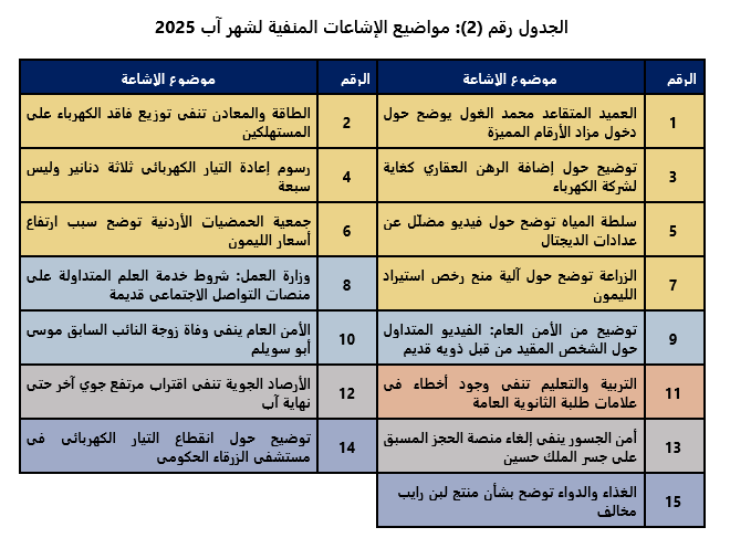 يوفر الجدول رقم (2) حصرًا لمواضيع الإشاعات التي تم نفيها من قبل جهات معنيّة بها خلال شهر آب، ويمكن لمن يرغب في معرفة مزيد من التفاصيل عن هذه الإشاعات استخدام خاصيّة "الهايبر لينك" لهذا الغرض